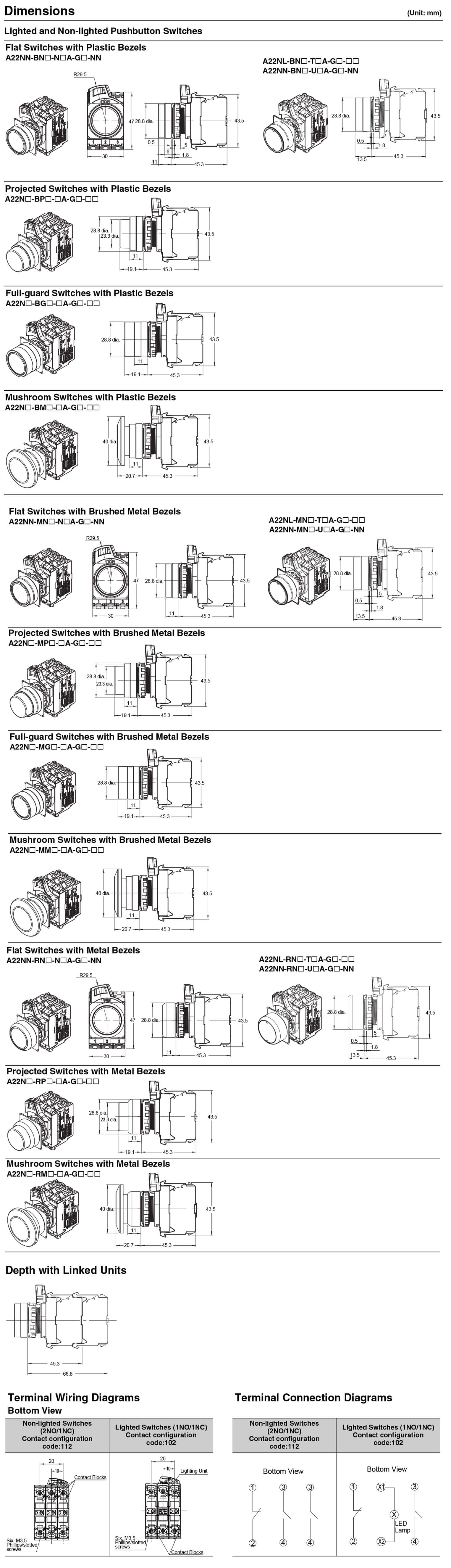 Omron A22N; Yuvarlak basmalı anahtarlar hem ışıklı hem ışıksız olarak plastik, fırçalanmış metal ve metal bezel seçenekleriyle gelir. Renk kodlama, çalışma süresi ve güvenlik açısından avantajlıdır.